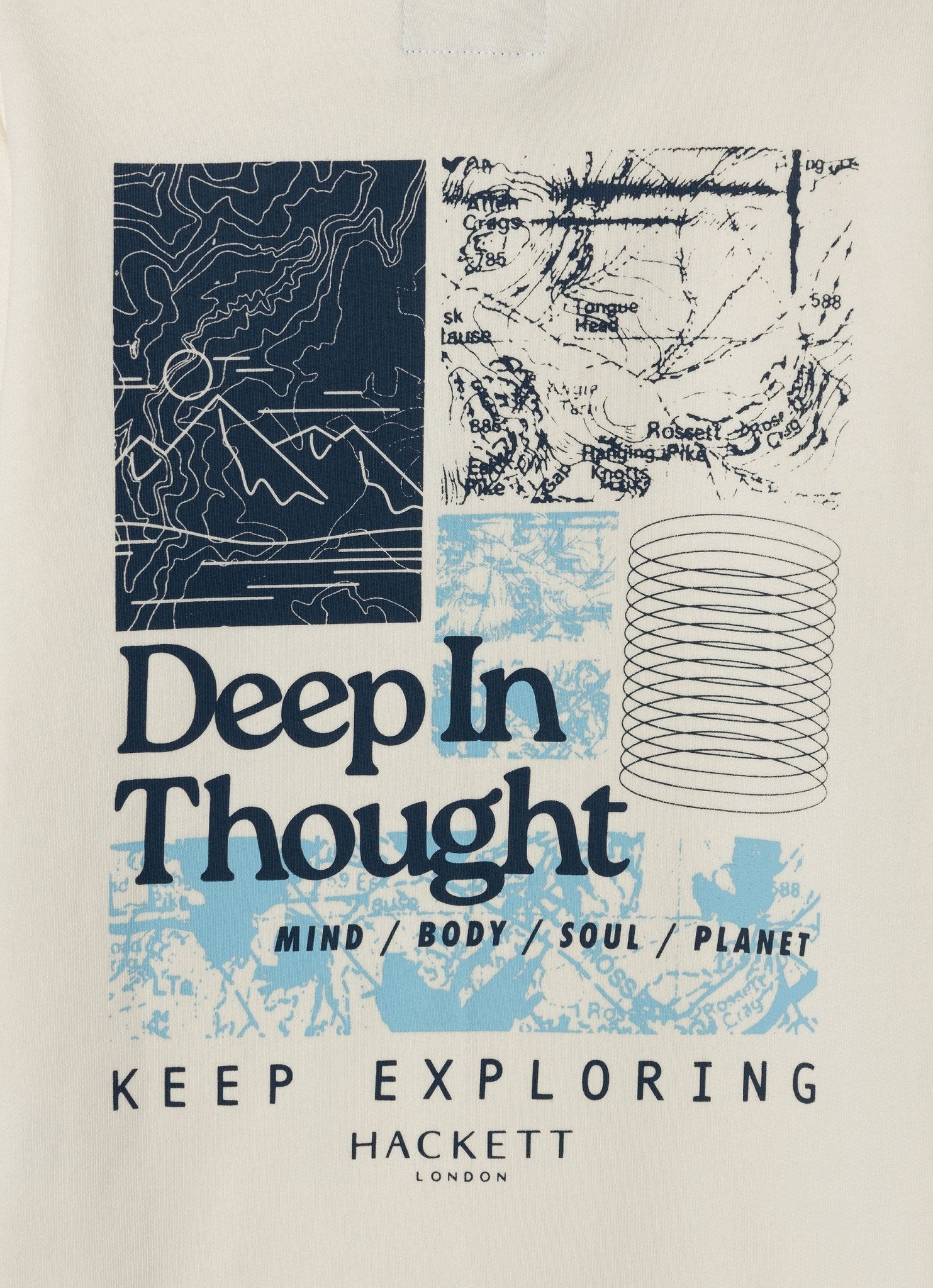 The Deep Thought Sweater, made from 100% brushed-back cotton, combines warmth and softness with a sophisticated design. It features a funnel neck and button-down closure for adjustable comfort, alongside a practical kangaroo pocket. The standout detail is the large "DEEP IN THOUGHT" graphic on the back, adding a bold, intellectual edge to this versatile sweater.