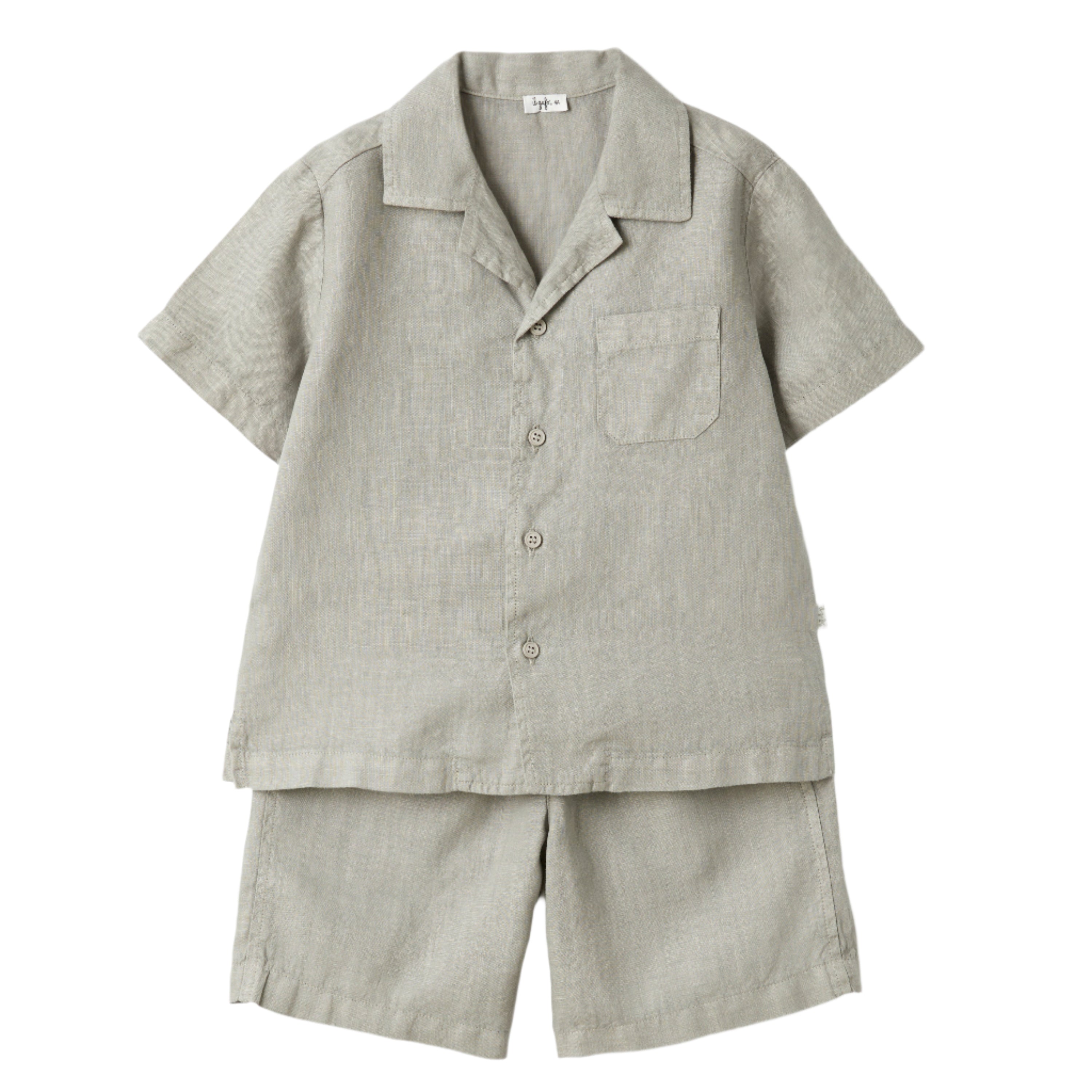 • Two-piece linen baby set. Shirt with front button closure, patch pocket, and side slits. Bermuda shorts with an elastic waistband and drawstring, slit pockets, and a patch pocket on the back.
