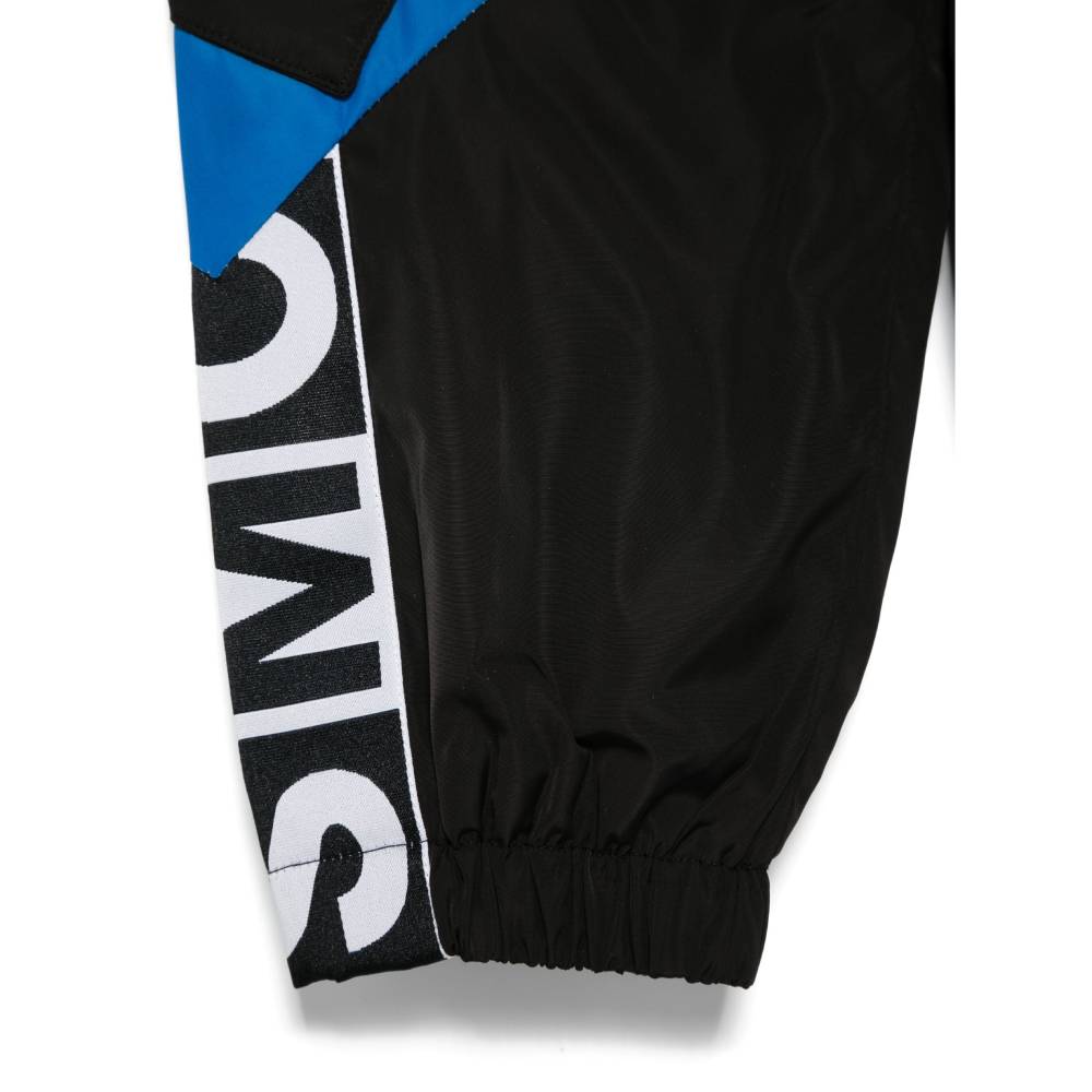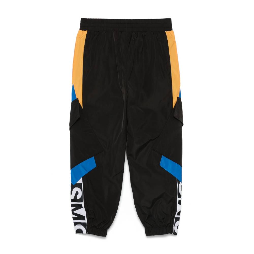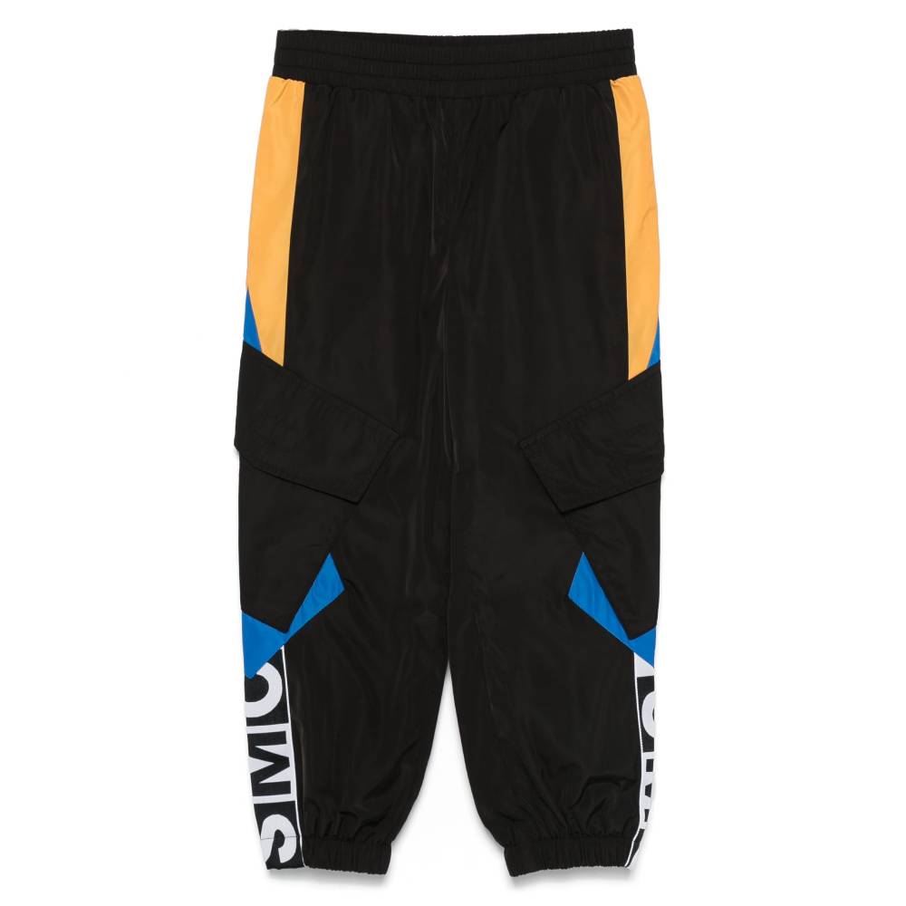 Black pants for boys by Stella McCartney. Made from cotton, it features an all-over colourful logo print pattern. An elasticated waist for comfortable