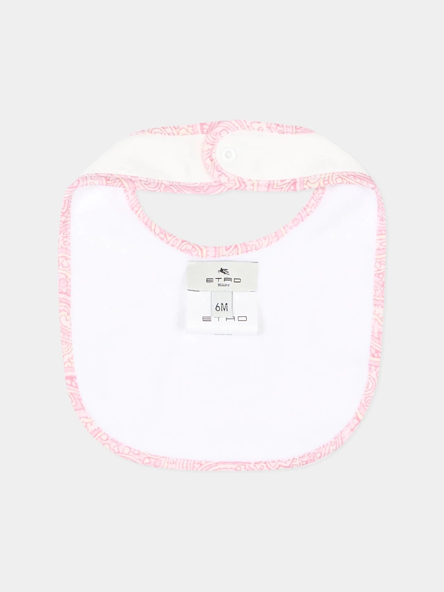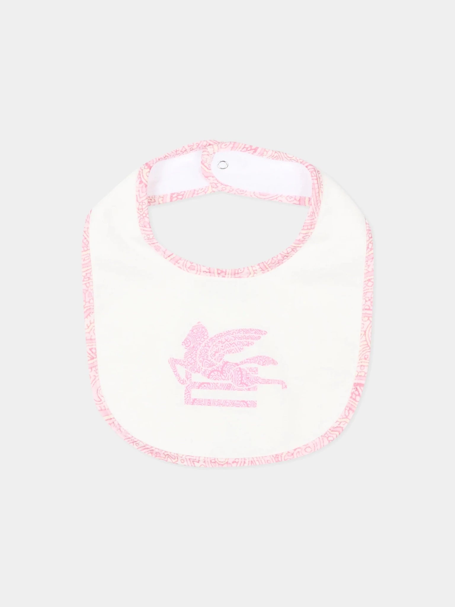 Etro's soft ivory cotton jersey onesie set includes a onesie, bib, and matching hat. The bib features pink paisley print trim and a central Pegasus logo paired with the Etro lettering, which is also repeated on the edge of the hat for a cohesive graphic effect. The long-sleeved onesie with attached feet features the same Pegasus motif on the front and a convenient snap closure at the back and crotch. Clean lines and contrasting logo details create a delicate and distinctive ensemble.