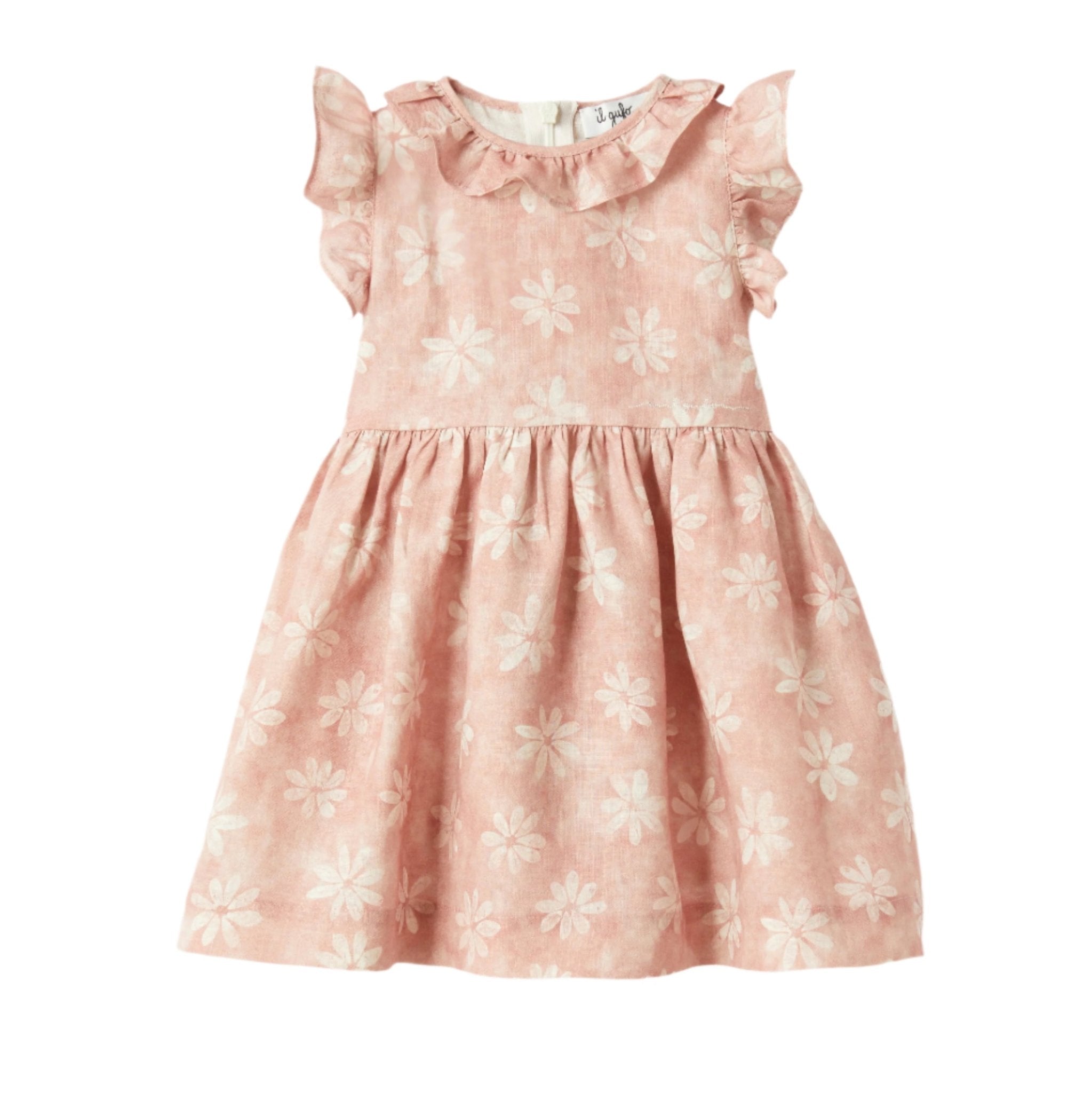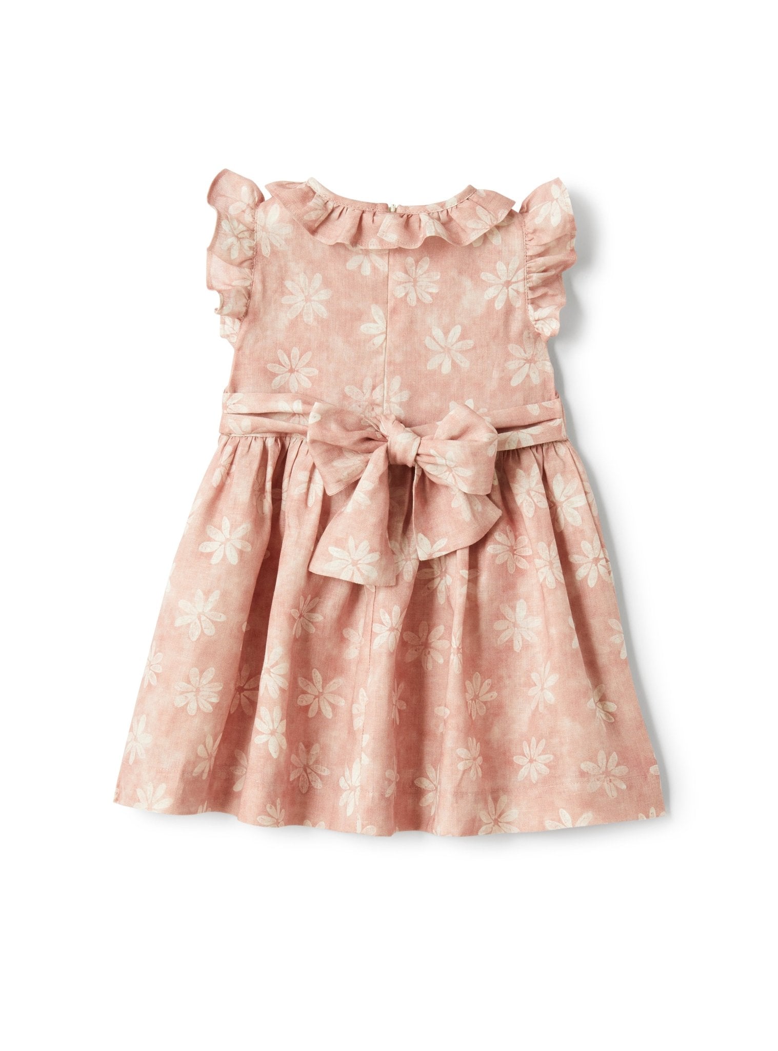• Floral print linen dress for newborns and toddlers, featuring a full skirt and delicate ruffles at the neckline and sleeves. The back is finished with adjustable ribbons tied in a bow and a hidden zipper for easy dressing. Ideal for both casual outings and special occasions.